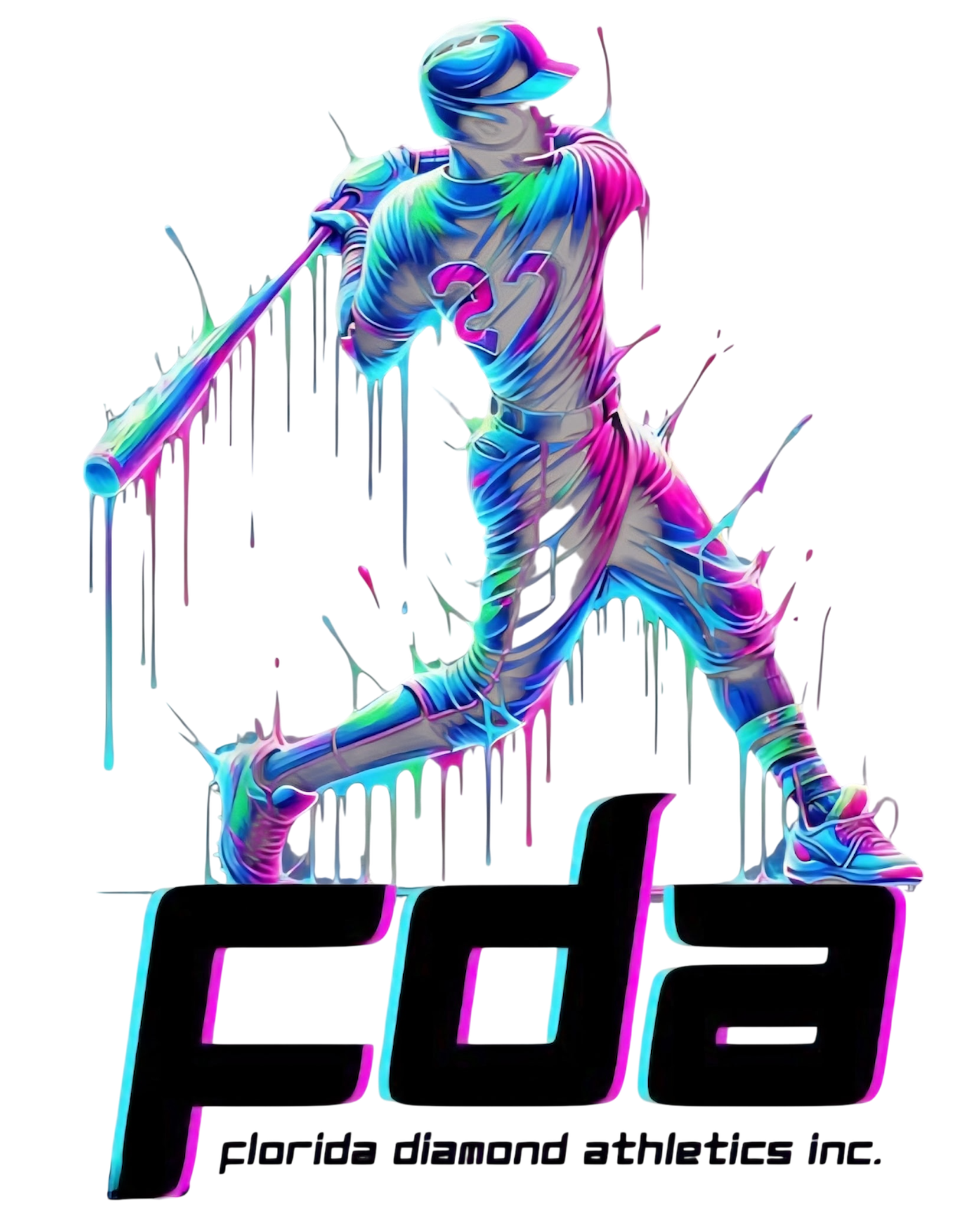 A colorful neon illustration of a baseball player in mid-swing with a bat, standing on the word 'Fla' in bright neon letters. The player wears a cap and sports uniform with the number 21.